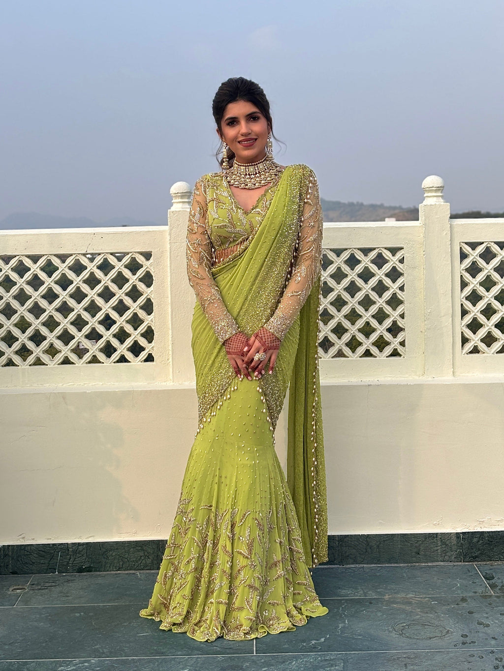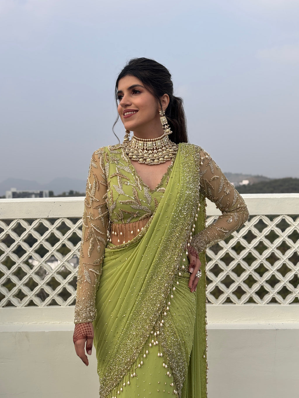 Apple green georgette sari heavily hand embellished with glass beaded light gold & pearl leaf embellishment, paired with a heavily embellished border & a matching blouse on net.