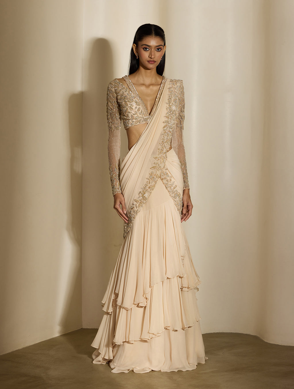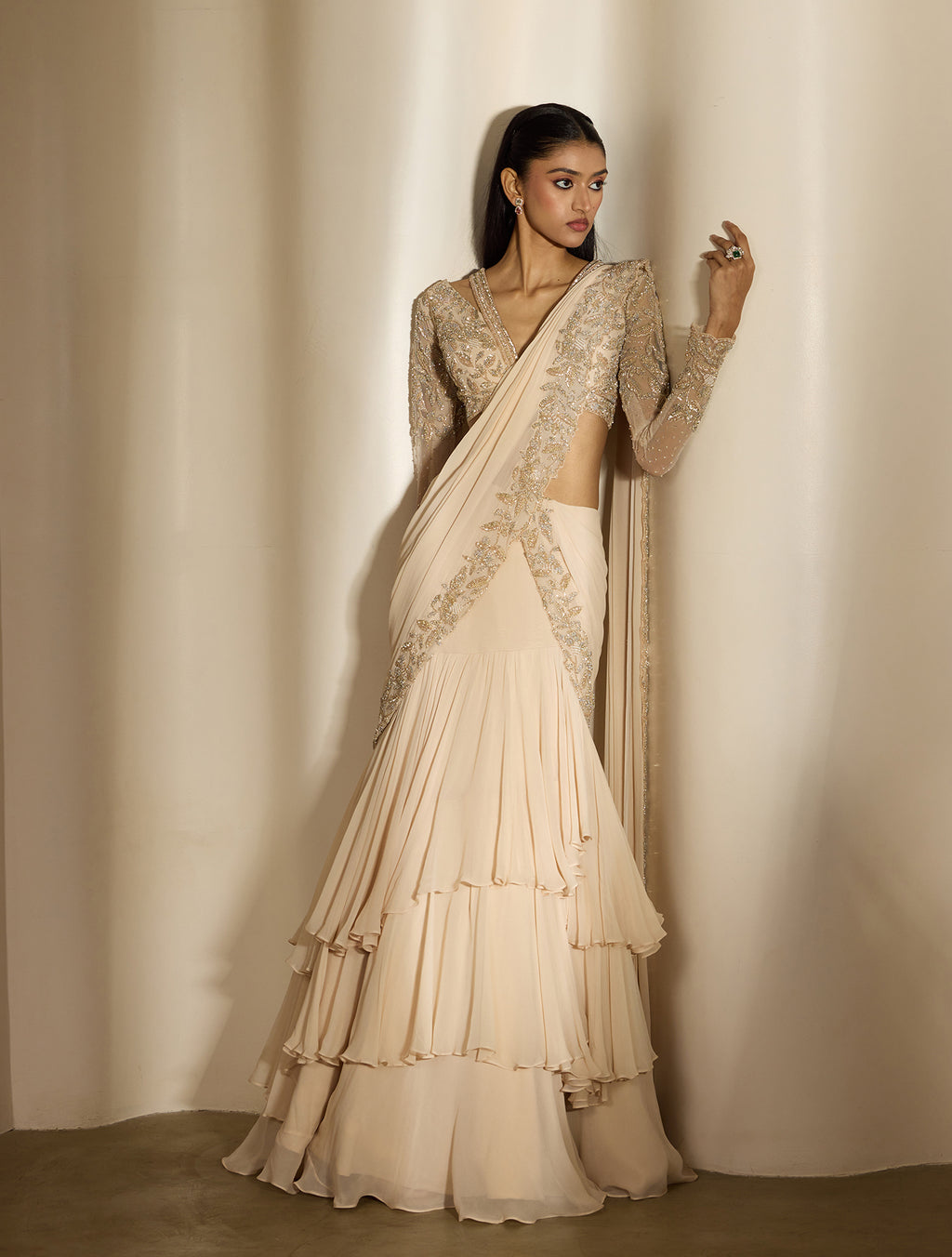 Ecru layered georgette sari featuring a hand embellished pally with ivory and silver fan flowers. Paired with a full sleeve matching hand embellished blouse & a tie back.