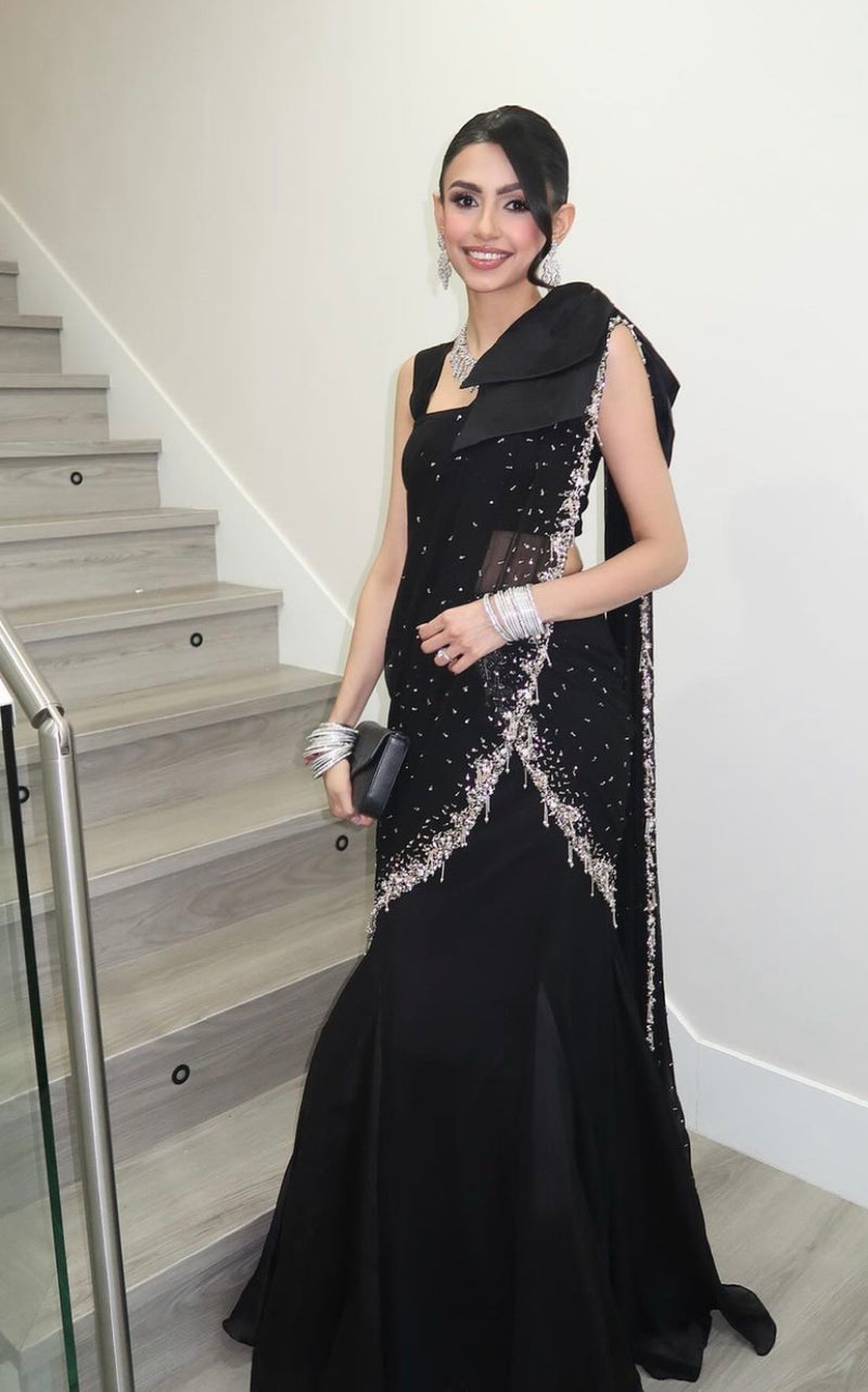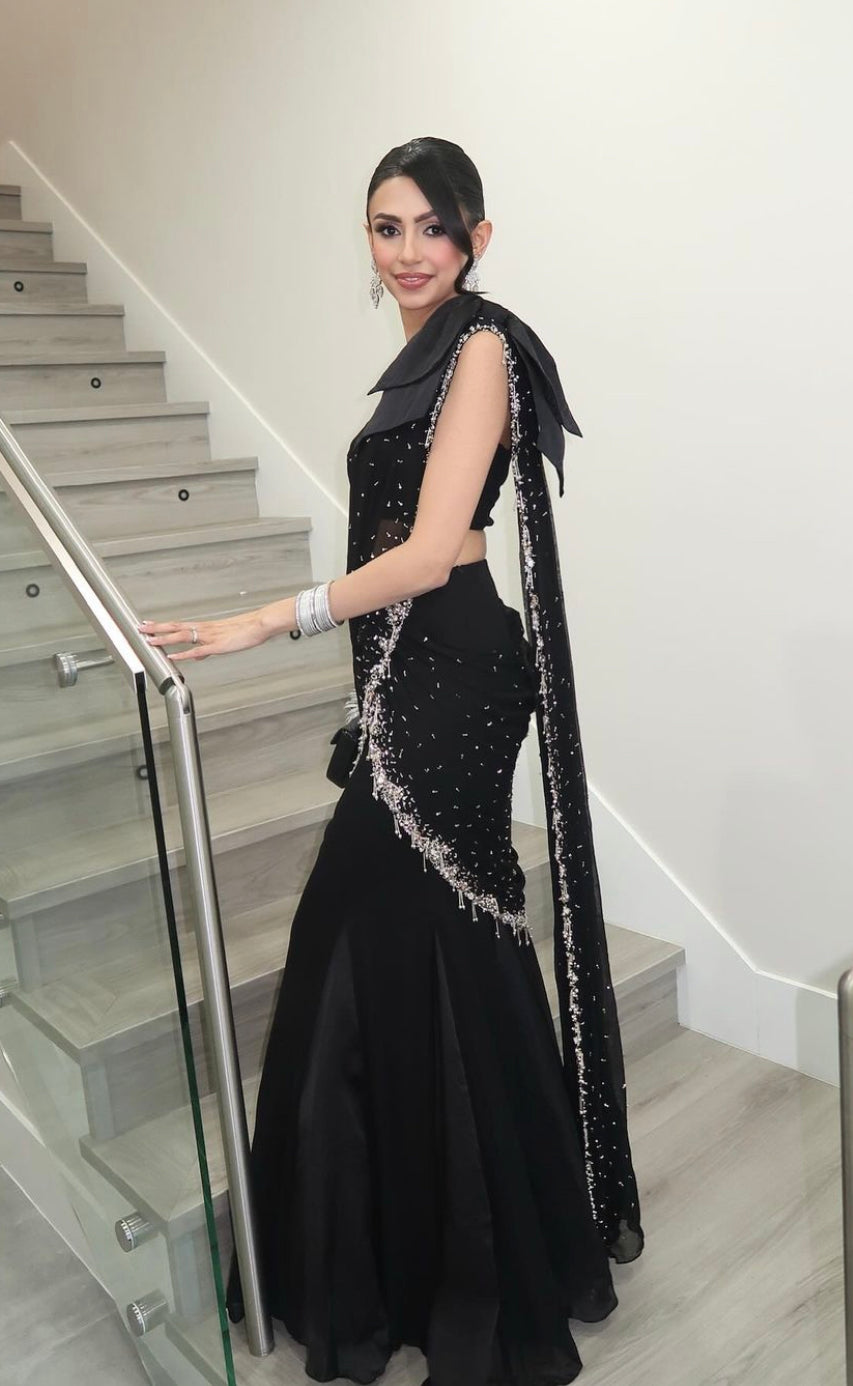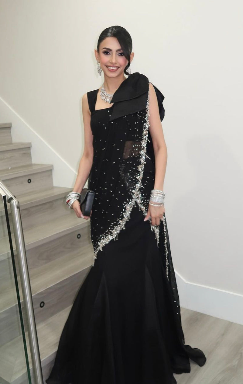 Black georgette & organza fish sari featuring hand embellished ivory pearls, silver glass bead & tassels on the pallu, with an oversized organza bow detail on the shoulder. Paired with a matching adjustable tie back blouse