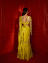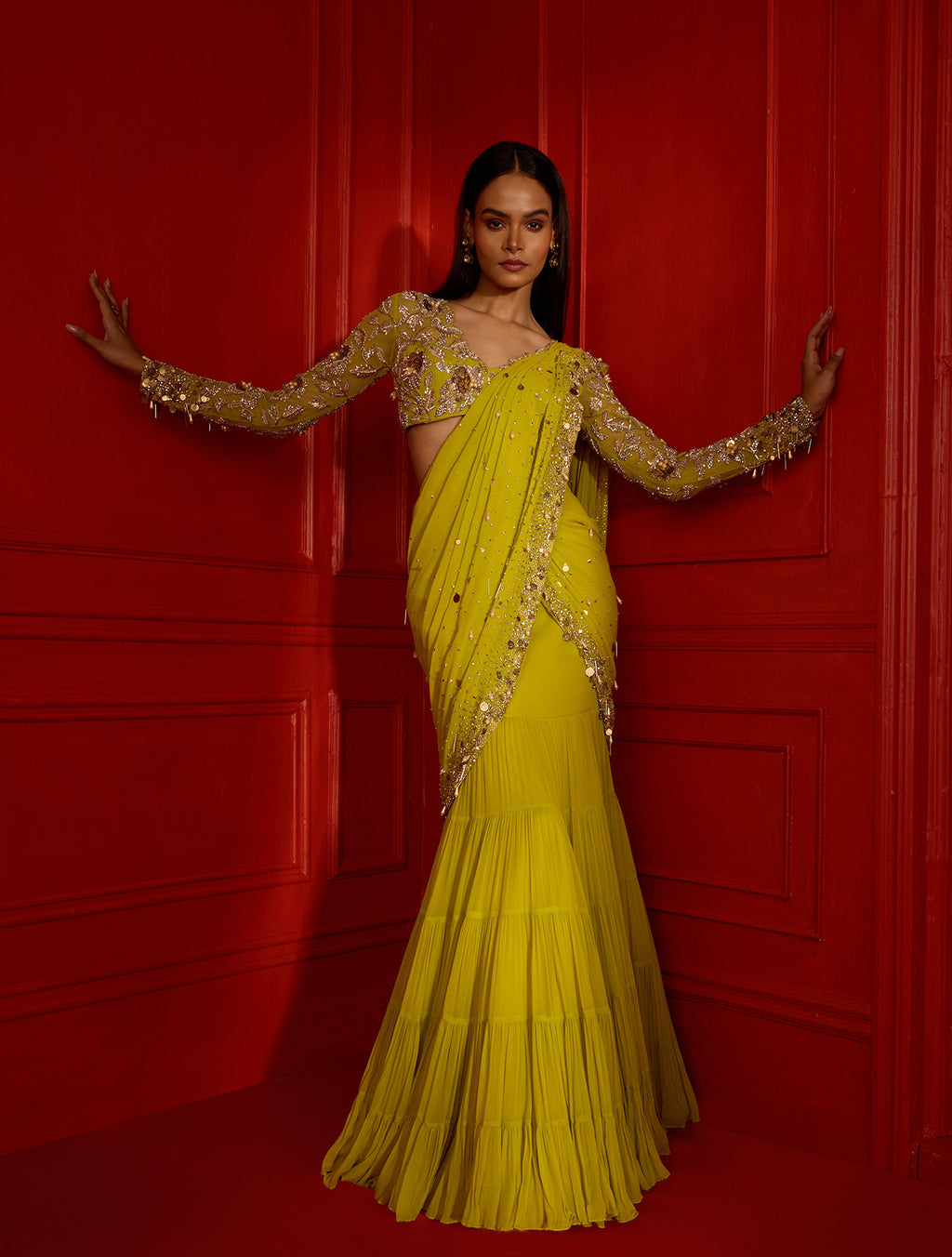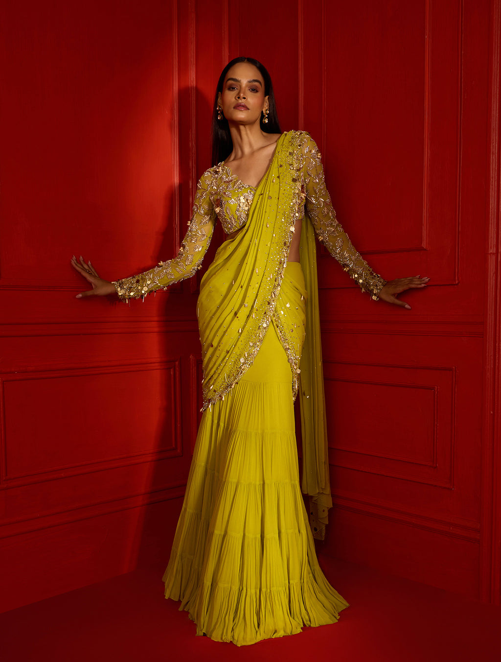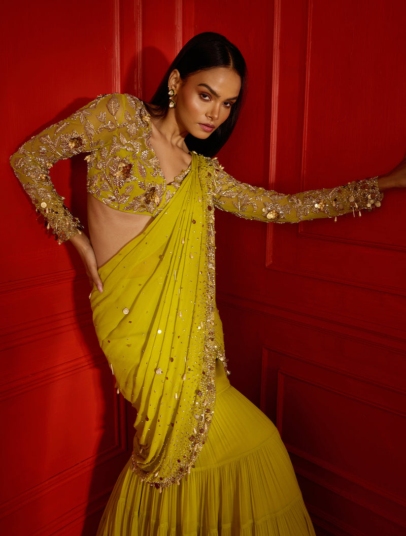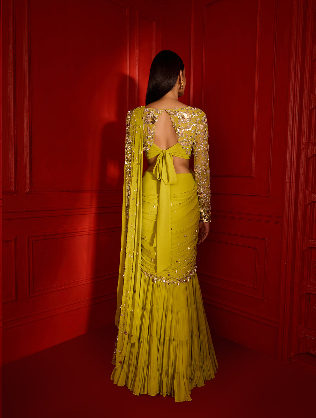 Lime green georgette tiered skirt with an attached pallu embellished with coins and drops. Paired with an embellished full sleeve sheer blouse featuring hand embroidered florals in tones of white gold and gold, and an open back with a tie up.