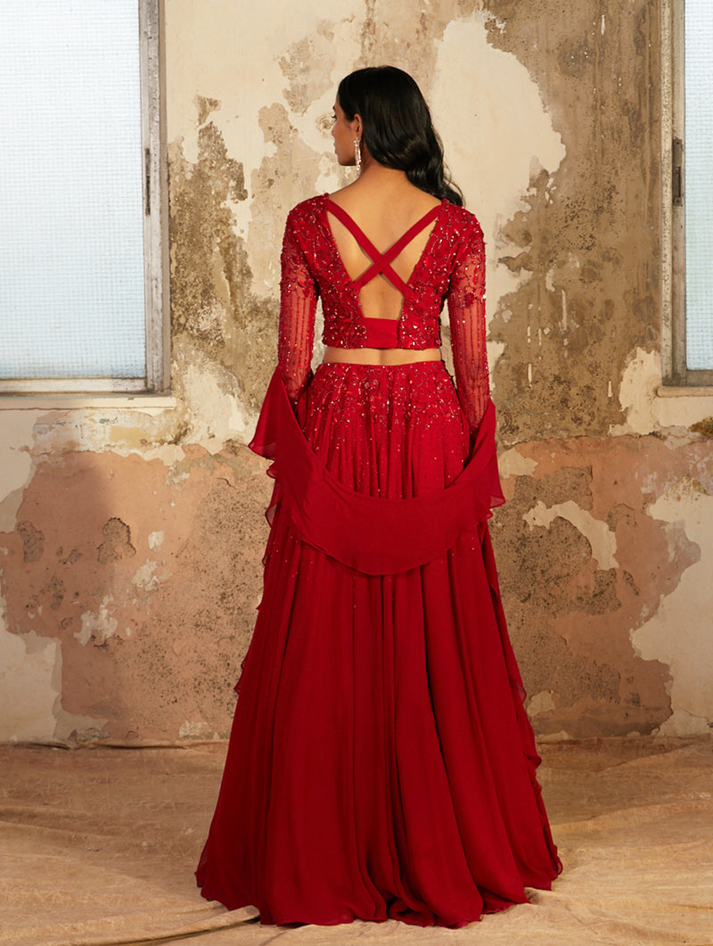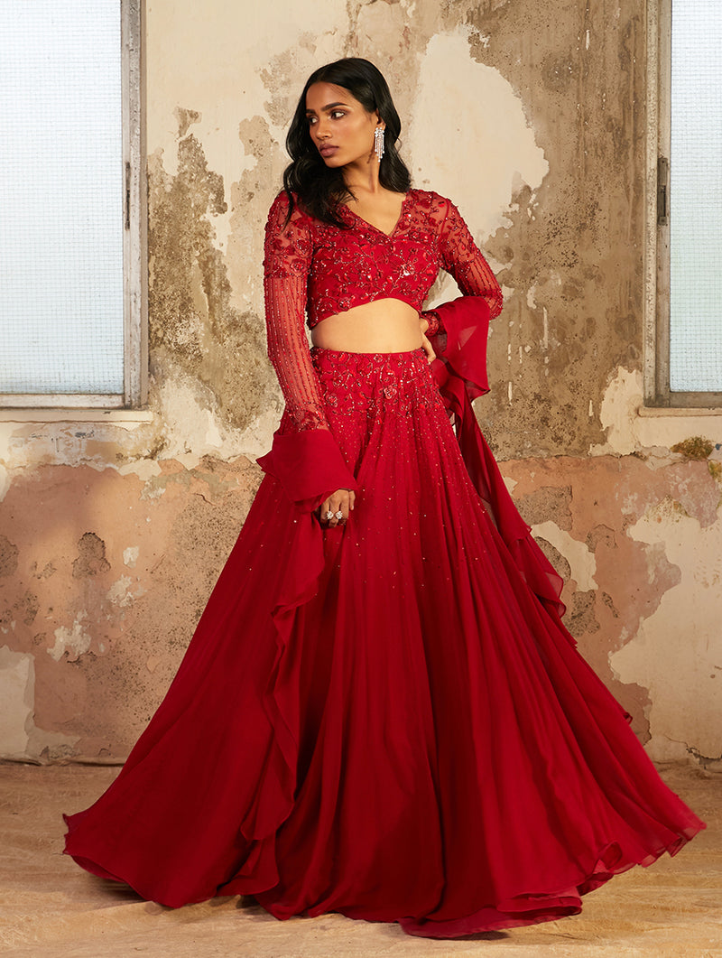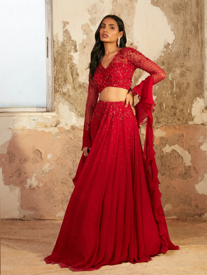 Red hand embellished floral georgette lehenga paired with a matching floral blouse with linear embellishment and a cross back along with a ruffle dupatta.