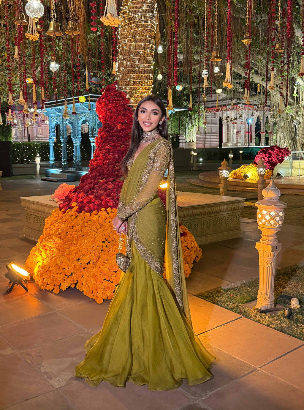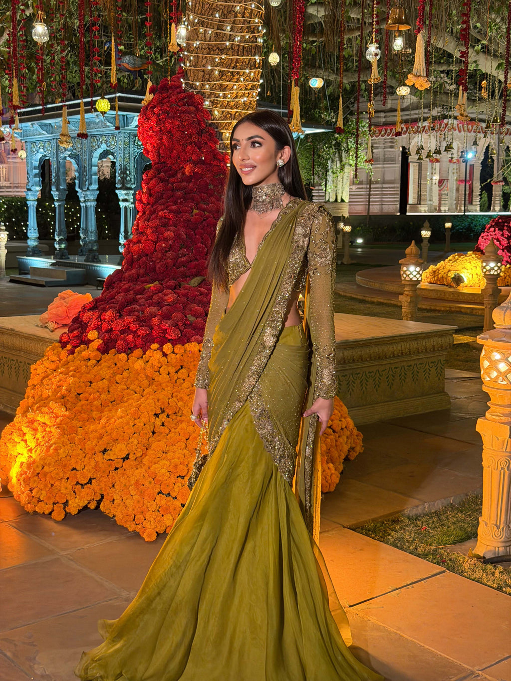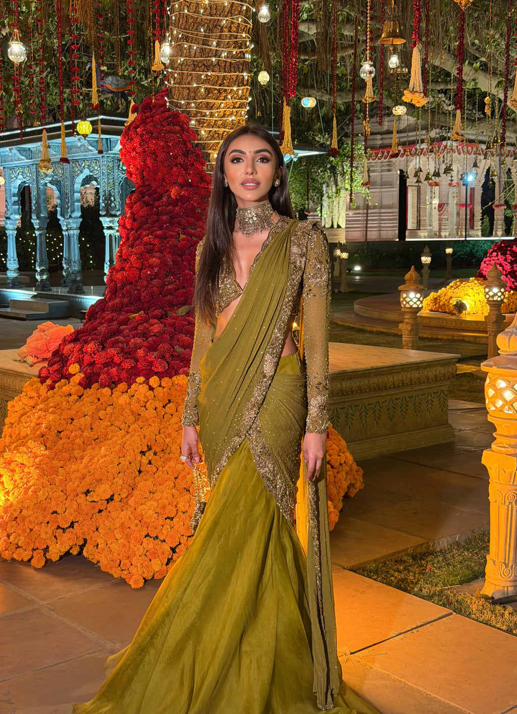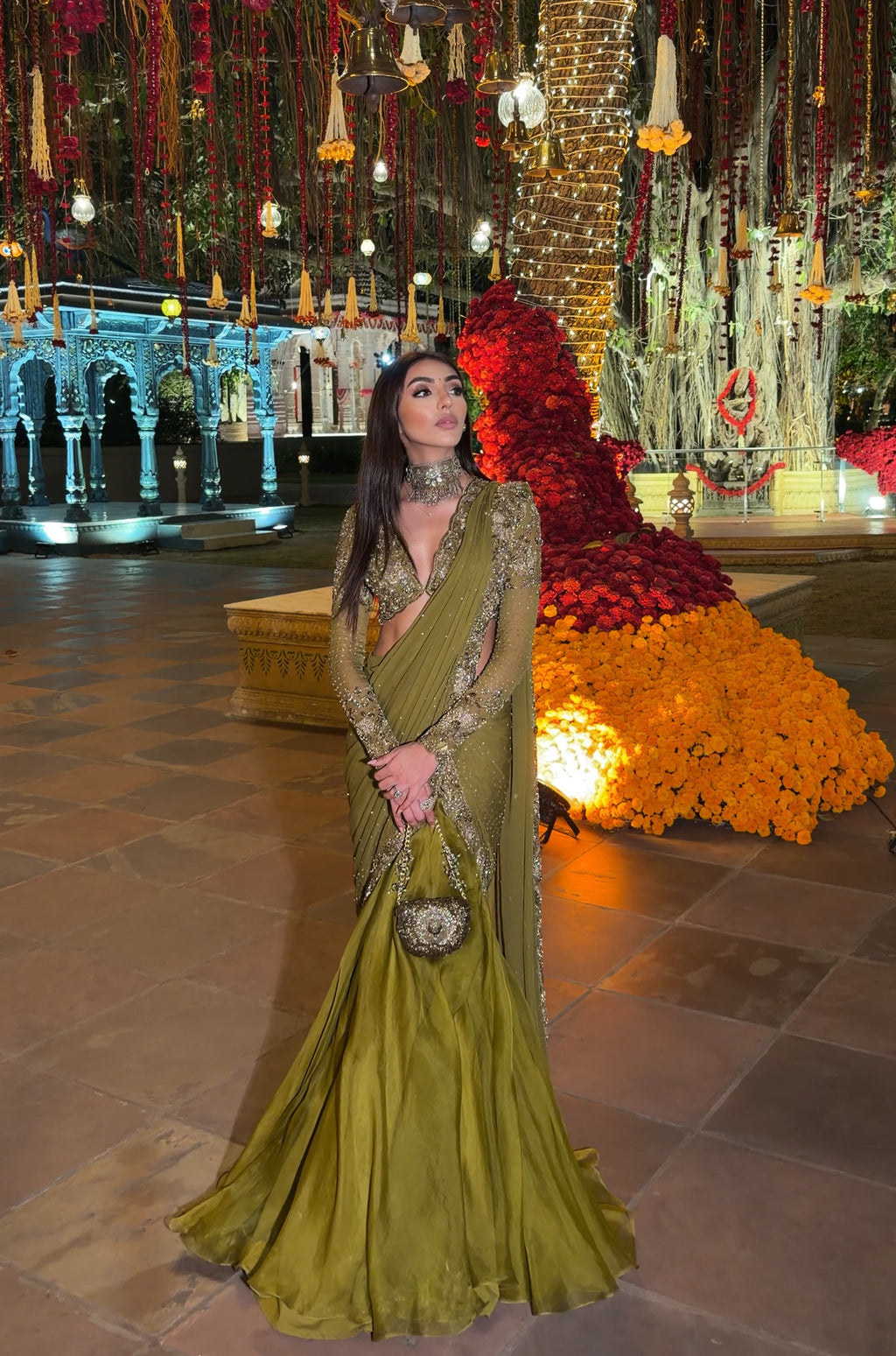 Olive green organza lehenga sari with an embellished pre-pleated and pre-stitched georgette pallu. Paired with a hand embellished plunge neck blouse with antique gold floral embellishment, full sleeves & a criss-cross tie back.