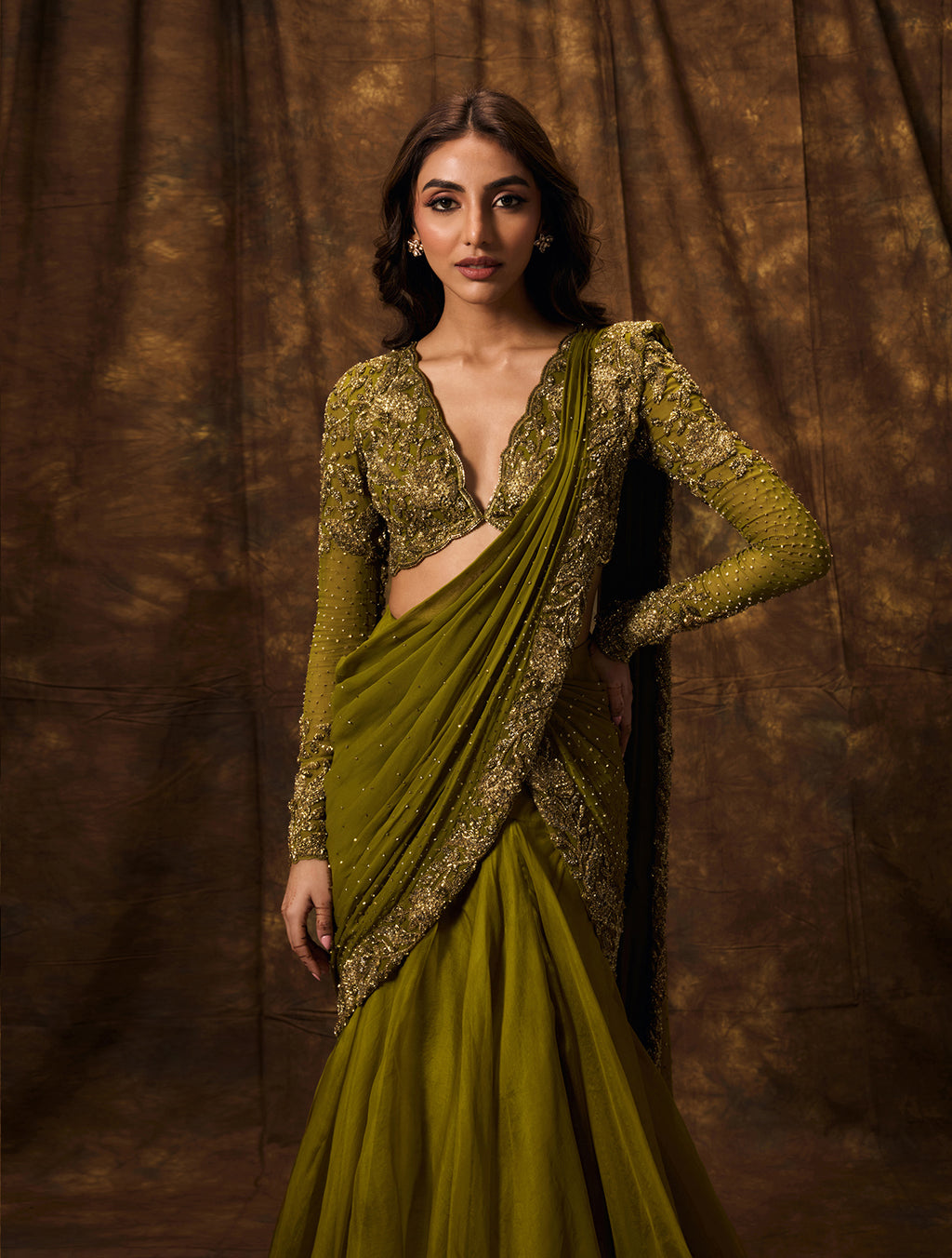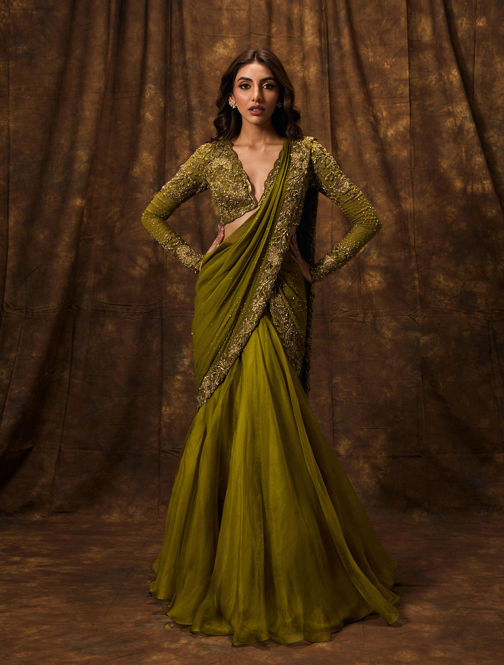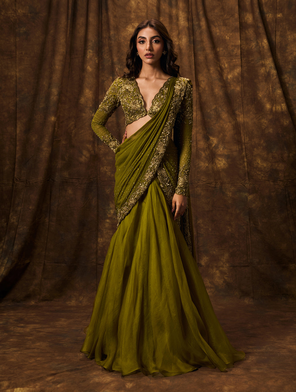 Olive green organza lehenga sari with an embellished pre-pleated and pre-stitched georgette pallu. Paired with a hand embellished plunge neck blouse with antique gold floral embellishment, full sleeves & a criss-cross tie back.