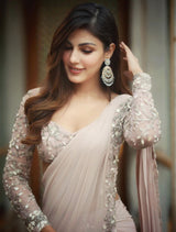 Dusty pink layered skirt with attached pre-draped and pre-stitched pallu featuring a hand embellished floral silver champagne zardozi and mother of pearl border. Paired with a matching embellished blouse with a sweetheart neck & sheer sleeves, and a tie back.